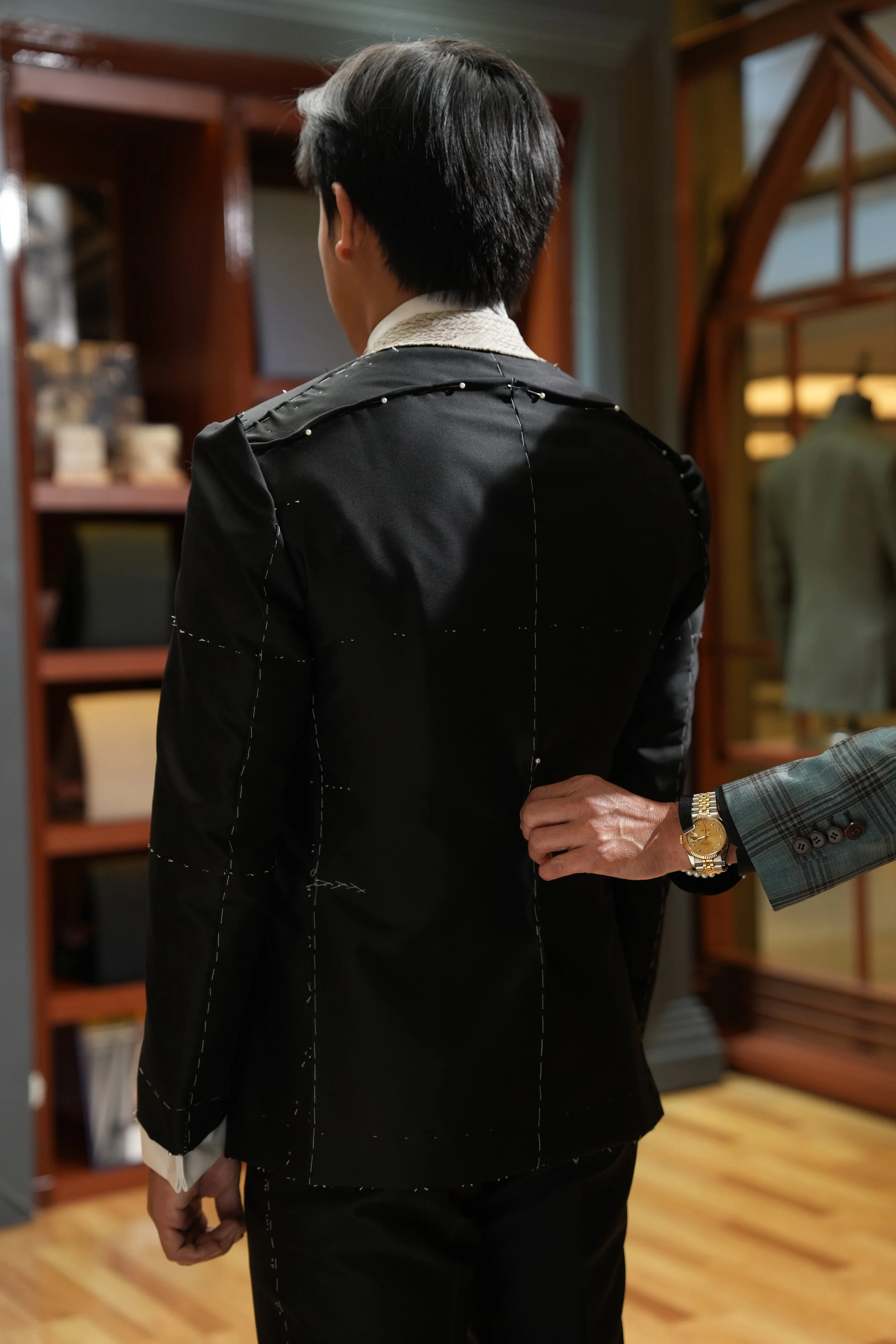 One core aspect is front–back balance. You can observe this by looking at the jacket’s hem from the side—ideally, the front and back hems should be level. But different builds require different adjustments. A person with prominent shoulder blades may need extra length at the back. Someone with a fuller stomach may need more balance at the front to prevent the jacket from riding up.